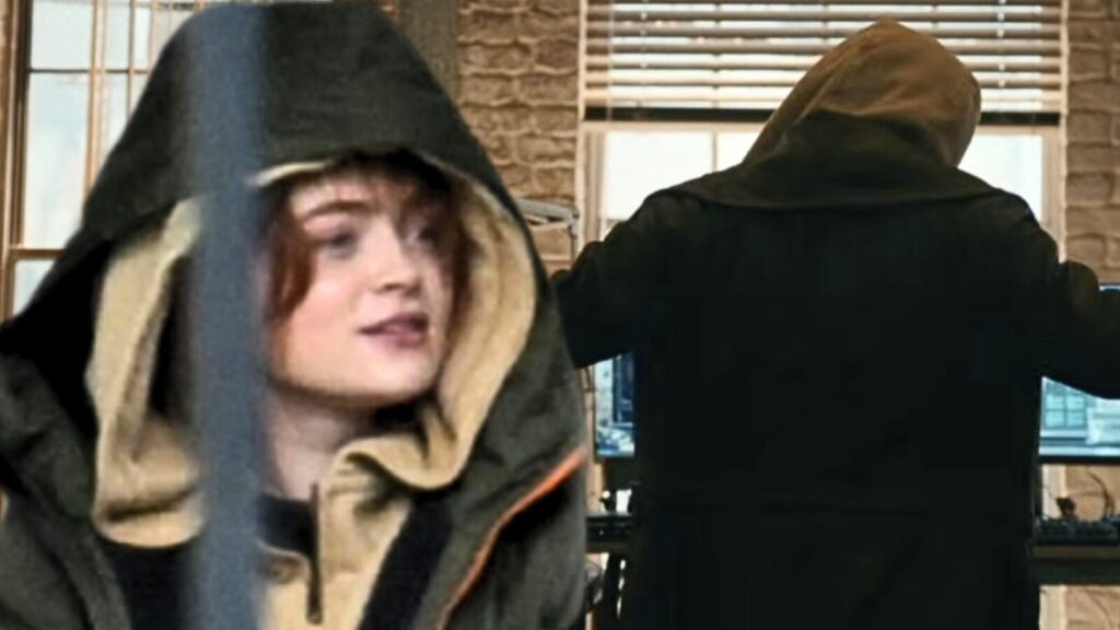 Nas imagens notamos que a blusa que Sadie Sink está usando é escura e tem um detalhe bege amarelado na parte de cima no capuz. Já no trailer, aparece uma figura misteriosa usando uma roupa muito parecida, a cor escura e o detalhe no capuz se assemelham muito.